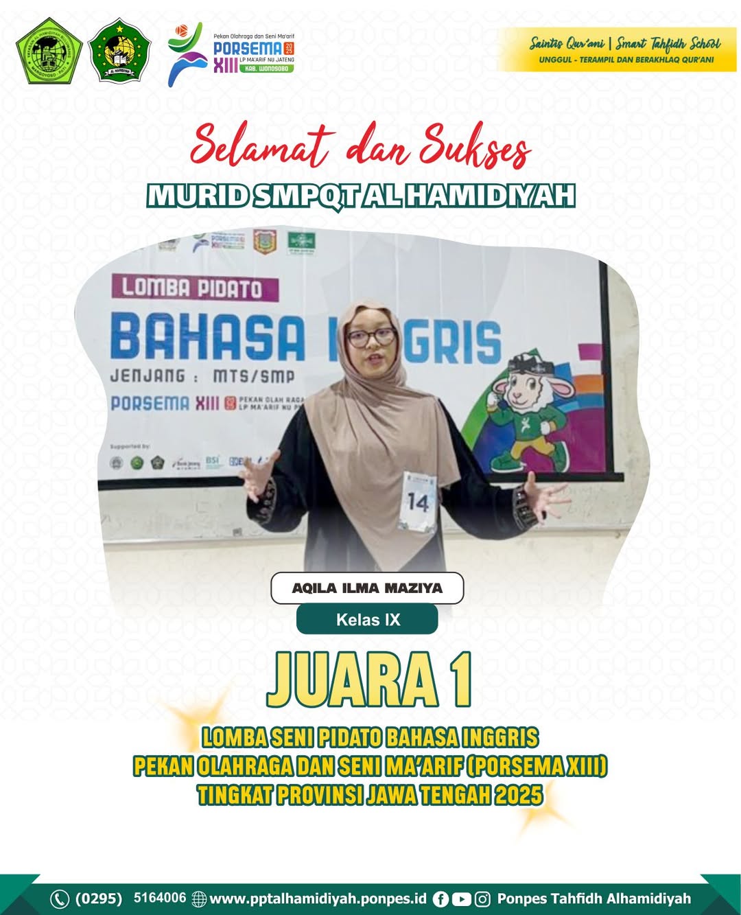 JUARA 1 LOMBA SENI PIDATO BAHASA INGGRIS PORSEMA XIII TINGKAT PROVINSI JAWA TENGAH 2025